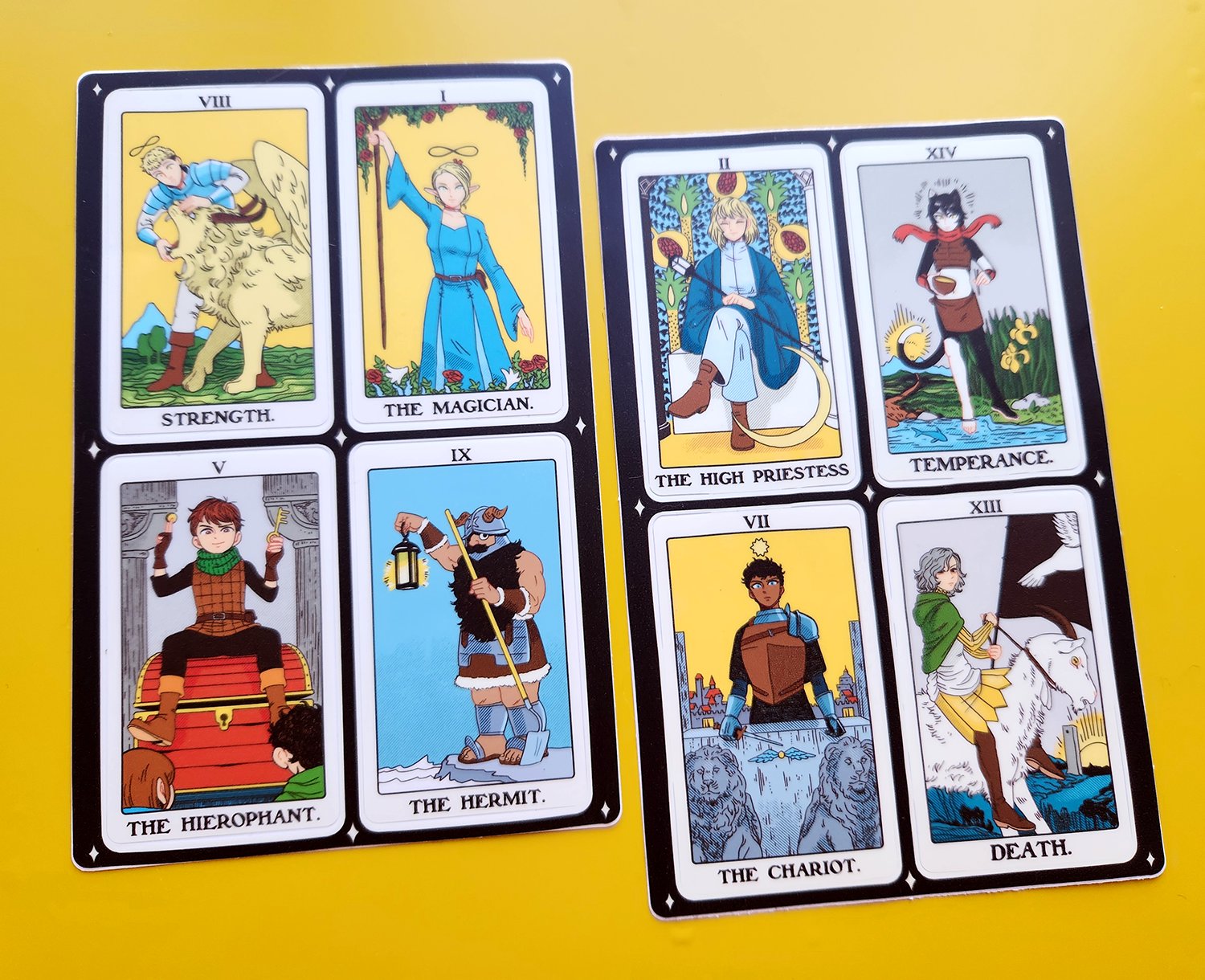 My Dungeon Meshi tarot cards as sticker sheets! Each sheet measures 5x7 inches, with individual stickers measuring about 2x3.5 inches. Set A includes Laios, Marcille, Senshi and Chilchuck while Set B includes Falin, Izutsumi, Kabru and Mithrun.