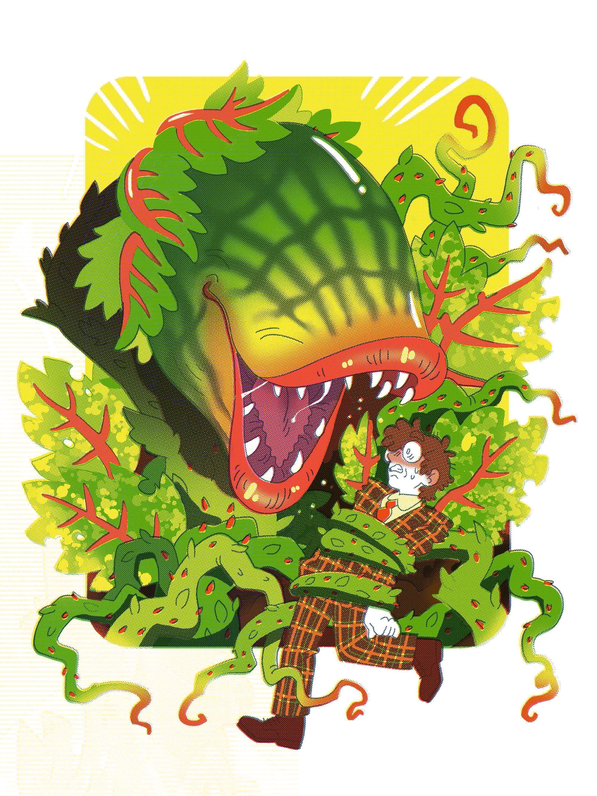 8.5x11 digital print of Seymour and Audrey II from Little Shop of Horrors! This print was previously only available as a risograph, and is now available as a high quality digital print.