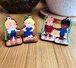 Mini wooden standees made to hold hands with their parter. Sold as 5 sets. Each includes a ball chain so you can use them as keychains, too! Measures about 2 inches tall.