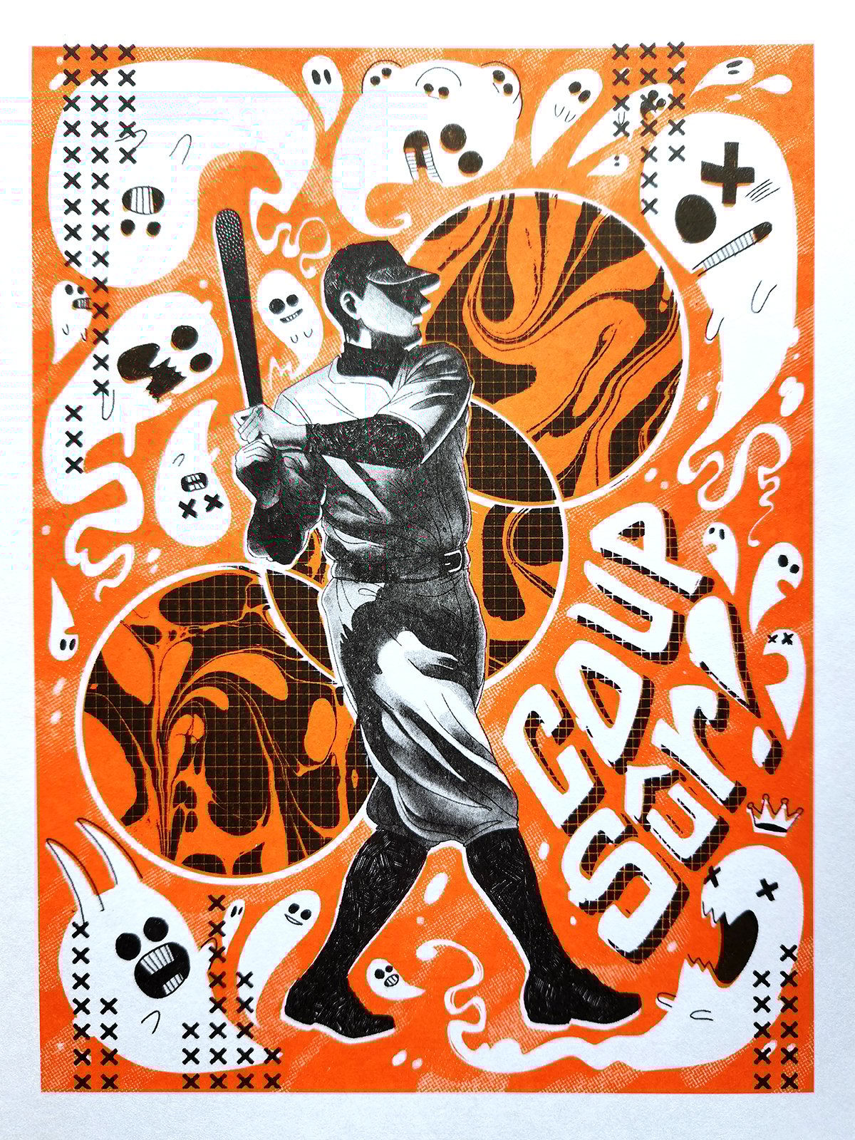 A risograph print of The Batter from the game OFF. Measures 8.5x11, available in orange or purple ink.