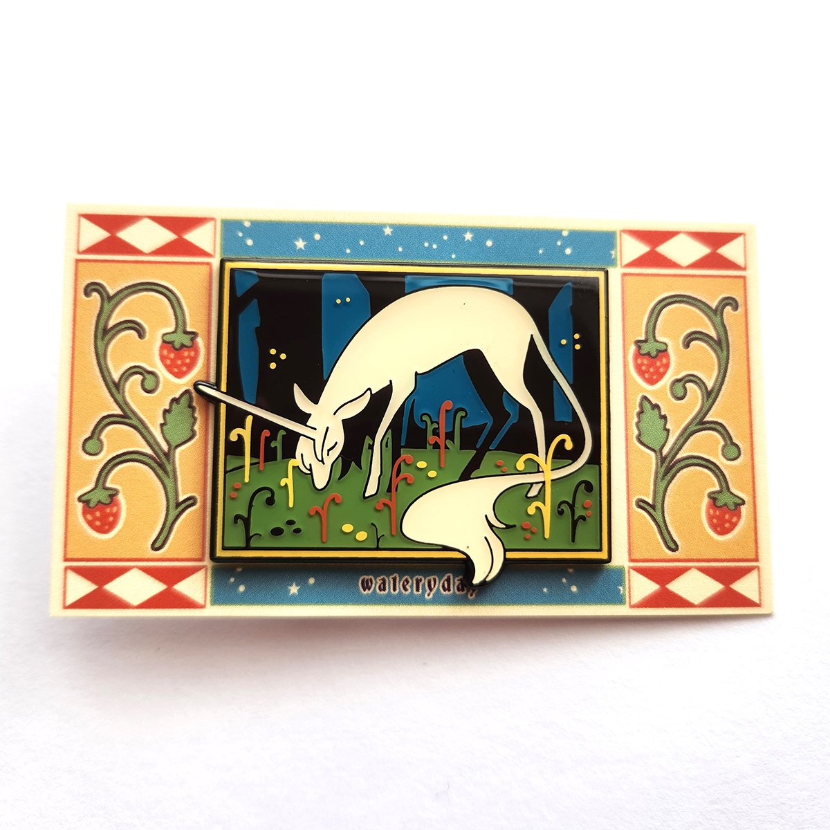 An enamel pin of a panel from the first page of my comic Unicorn, Hunted. Measures about 1.5 inches across; soft enamel with epoxy.